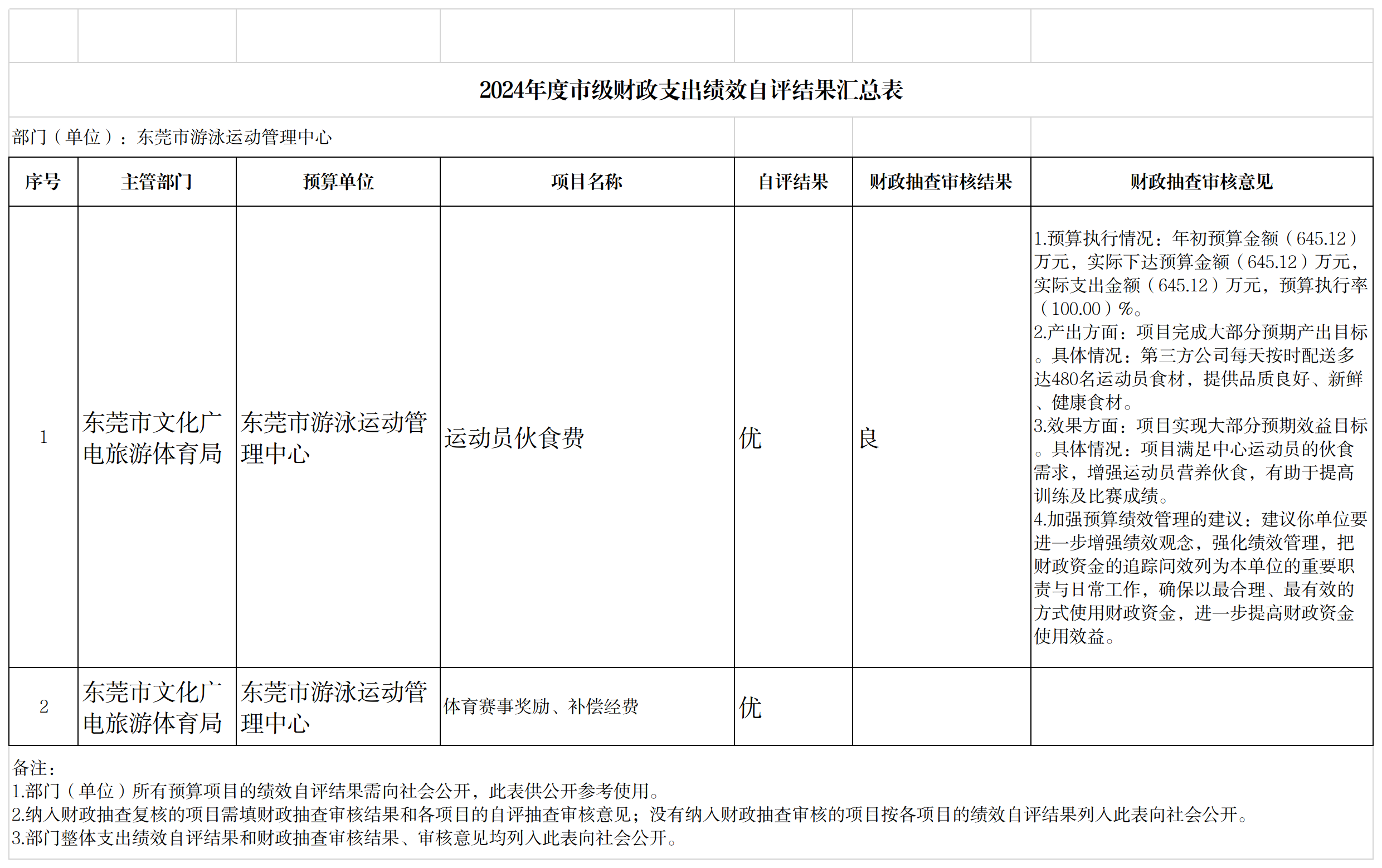 2024年度绩效自评结果汇总表(东莞市游泳运动管理中心)